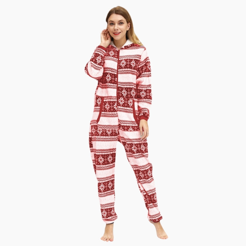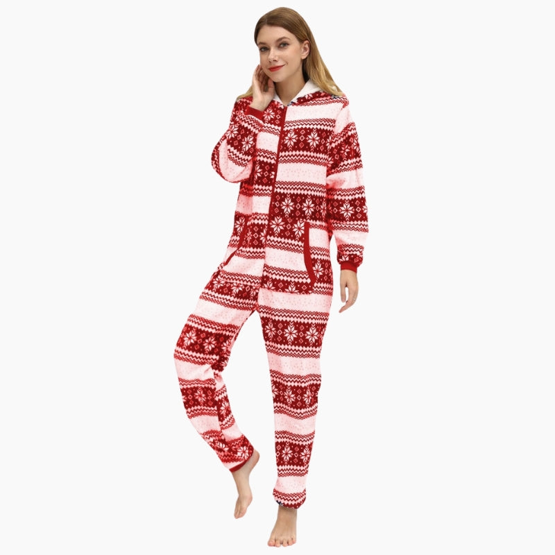 Combinaison chaude rouge et blanche sur le thème de Noël pour femme.