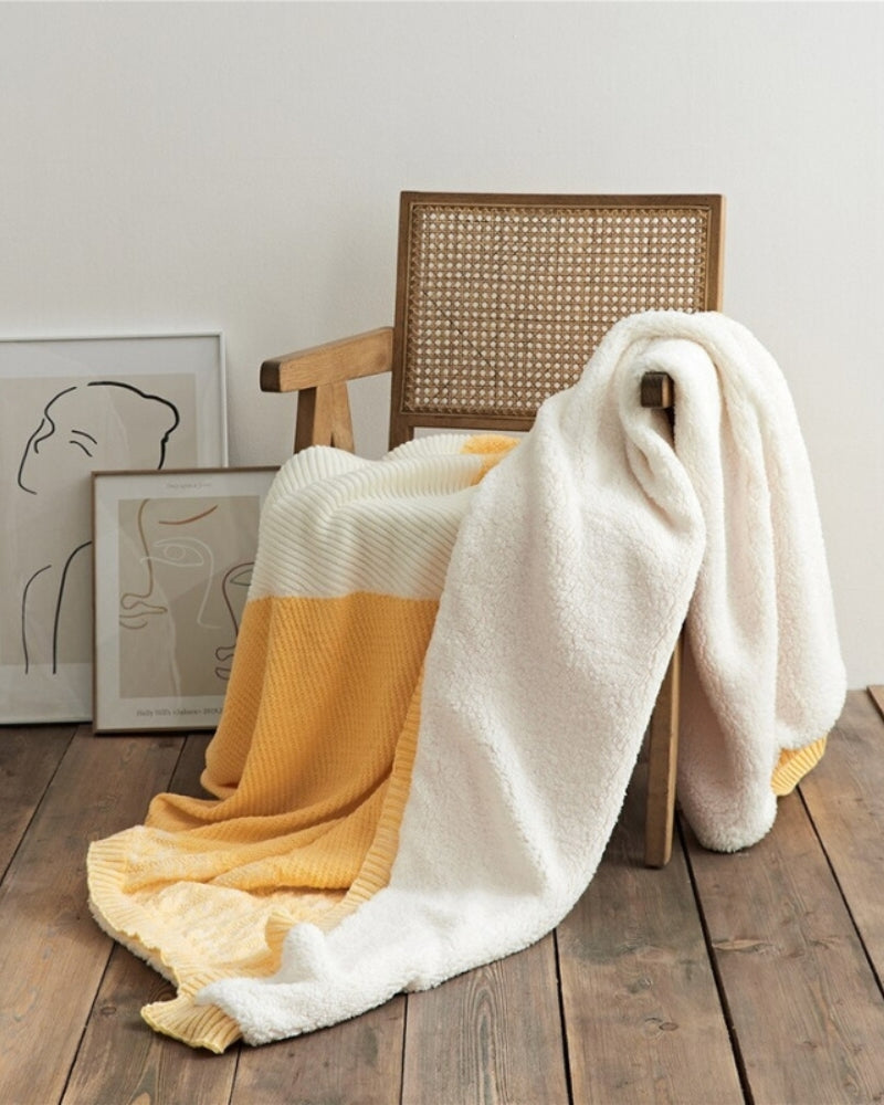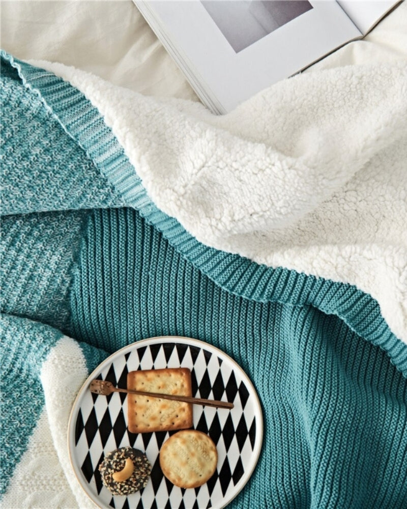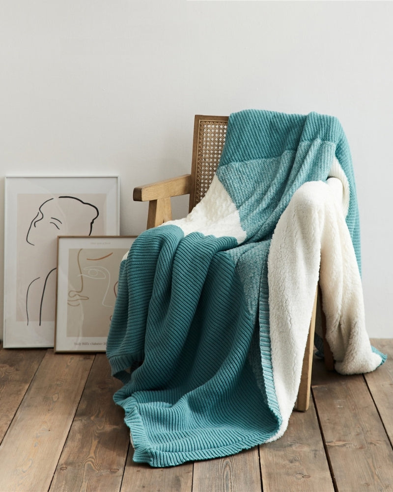 Si vous cherchez une grande couverture en laine de mouton synthétique vous êtes à la bonne adresse. Ce modèle est disponible en deux variantes, le bleu turquoise et le jaune.