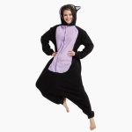 Onesie de couleur noire et violette style chat en matière Pilou Pilou polaire pour femme.