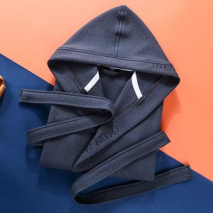 Le peignoir de bain est un vêtement ample, généralement conçu en tissu absorbant tel que le coton ou le velours éponge, permettant de se sécher rapidement tout en restant au chaud. Il est doté d’une ceinture pour le fermer et souvent d’une capuche pour couvrir la tête.