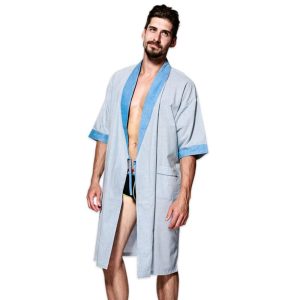 Le peignoir de bain est un vêtement ample, généralement conçu en tissu absorbant tel que le coton ou le velours éponge, permettant de se sécher rapidement tout en restant au chaud. Il est doté d’une ceinture pour le fermer et souvent d’une capuche pour couvrir la tête.