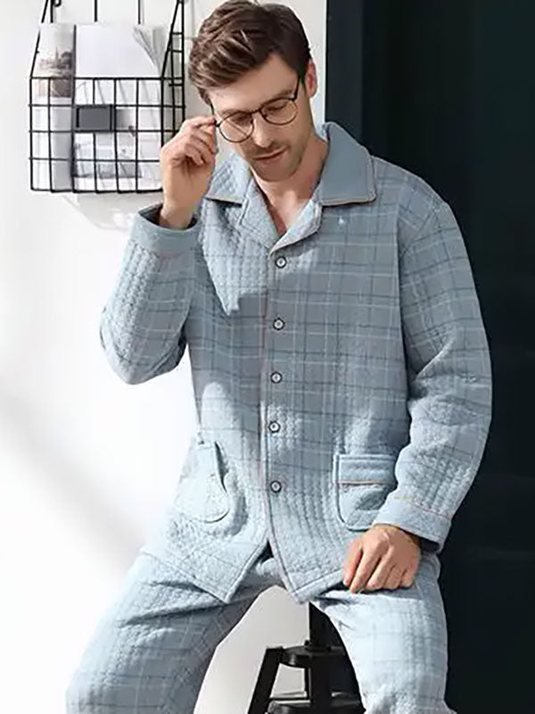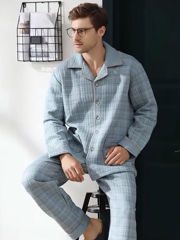 Découvrez le Pyjama Chaud Pour Homme En Coton « Confort Céleste », conçu pour vous offrir une chaleur douce lors des soirées fraîches. Fabriqué en coton épais, cet ensemble à carreaux bleu ciel vous enveloppe dans un confort exceptionnel. La chemise à manches longues et le pantalon assorti sont parfaits pour les saisons automne et hiver, vous permettant de rester au chaud tout en gardant un style élégant.