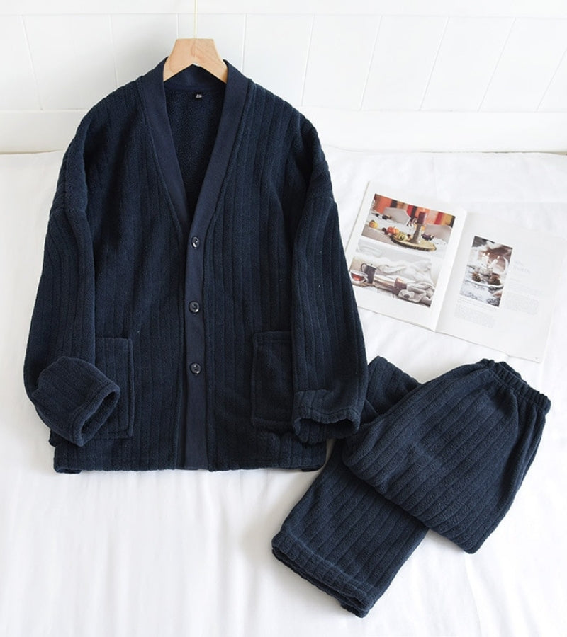 La partie supérieure possède un col en V qui apporte une touche de féminité décontractée à l’ensemble. Le haut de ce pyjama est également équipé d’une fermeture à boutons à l’avant.