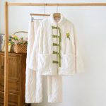 Le haut de ce pyjama a un col légèrement montant, une fermeture avec quatre boutons à l’avant ainsi que deux poches pour plus de praticité. Le bas également blanc cassé, assorti au haut est légèrement élastique au niveau de la taille.