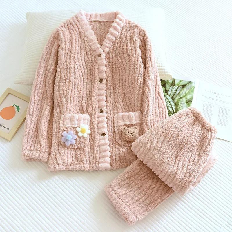 Quoi de mieux qu’un pyjama en molleton pour se maintenir bien au chaud à la maison ? Ce modèle de couleur rose possède une multitude de motifs et de détails, une alliance très à la mode parfaite pour apporter du style à votre garde-robe homewear.
