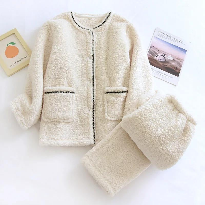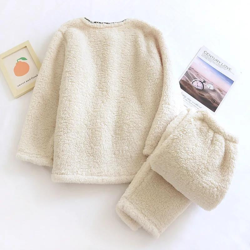 Vous connaissez le pyjama plaid ? C’est un pyjama deux pièces en matière plaid, un textile très doux, chaud et confortable. Cet ensemble est de couleur crème et ses bordures sont de couleur noire, une alliance très à la mode pour un rendu classique et élégant.