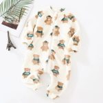 Ce pyjama de couleur blanche est orné de motifs adorables : des petits ours bruns portant des écharpes et des bonnets verts. La fermeture éclair à l’avant permet un habillage et un déshabillage faciles, facilitant également le changement de couches.